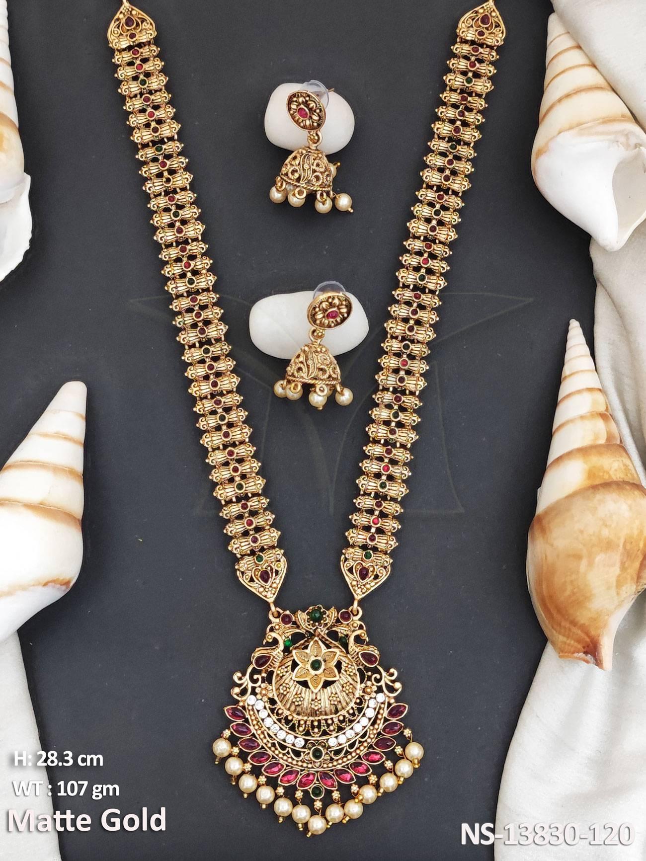 - Clustered Pearl Designer Wear Matte Gold Polish Fancy Design Kemp Long Necklace Set