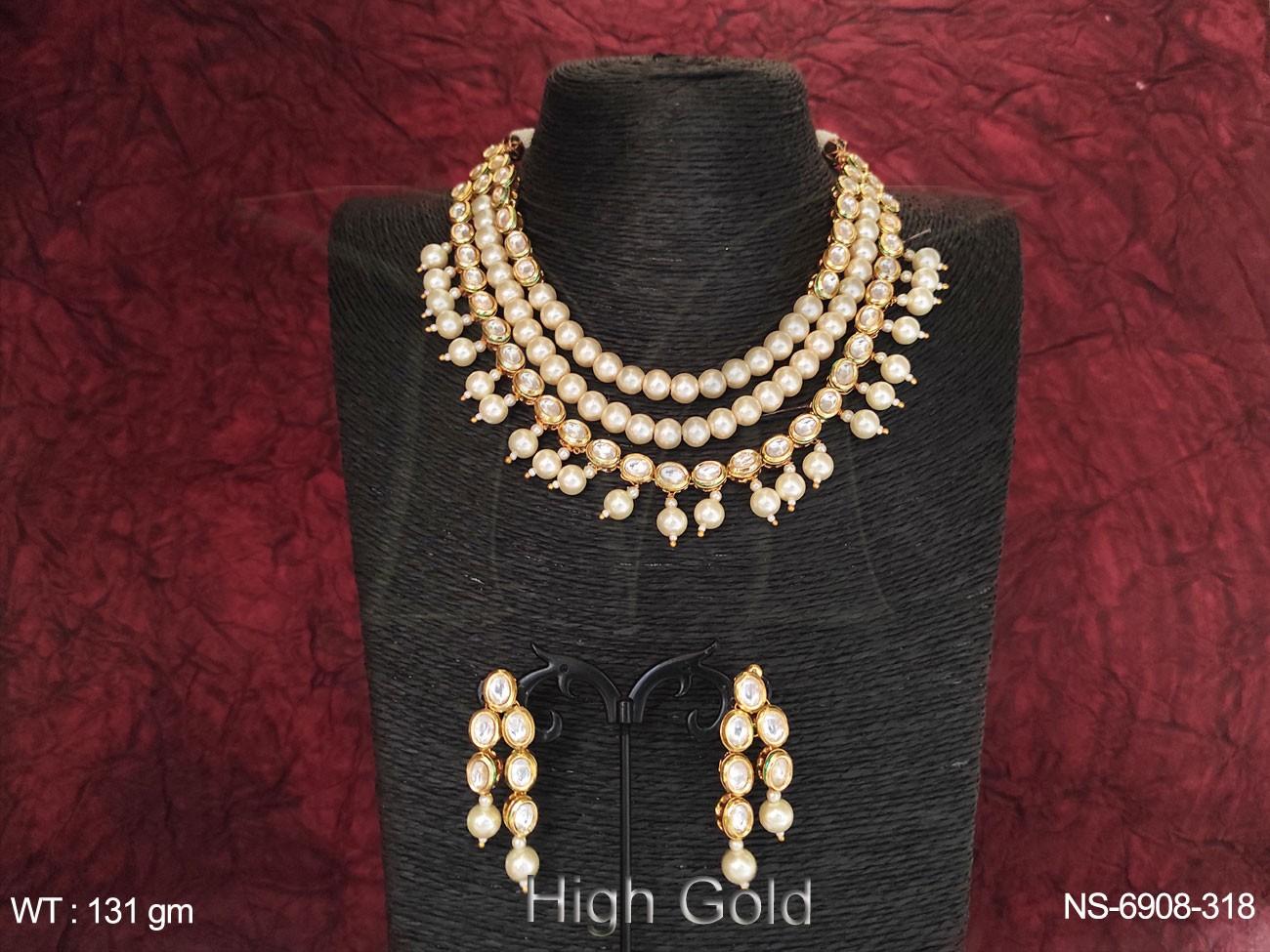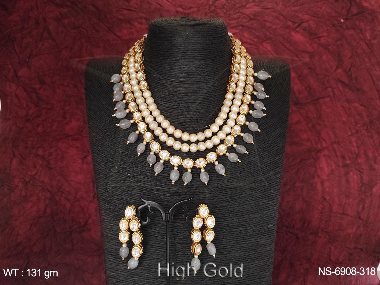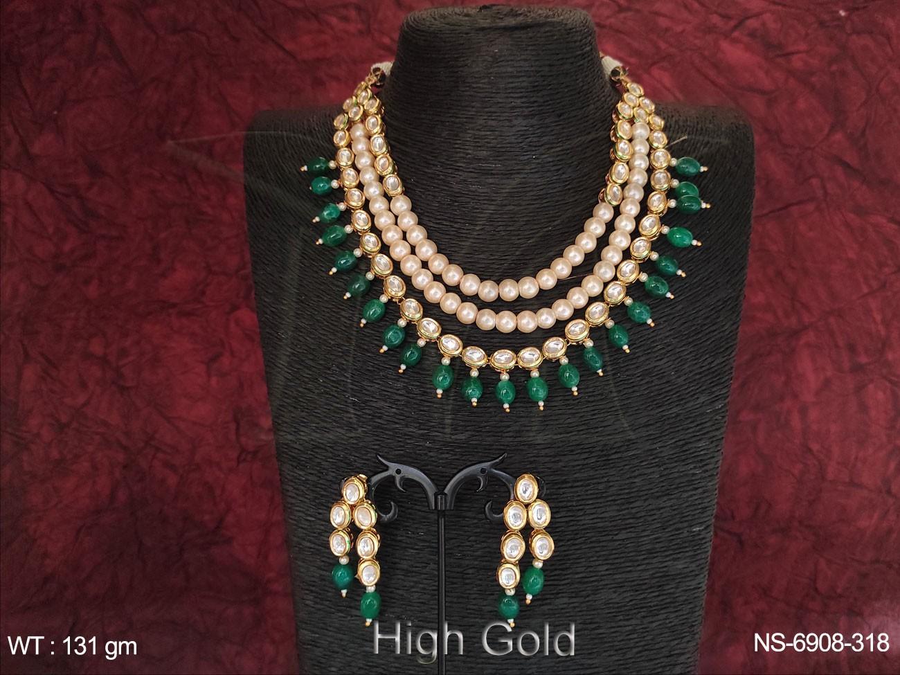 - Clustered pearl Kundan Heavy Three Line Moti Kundan Necklace Set