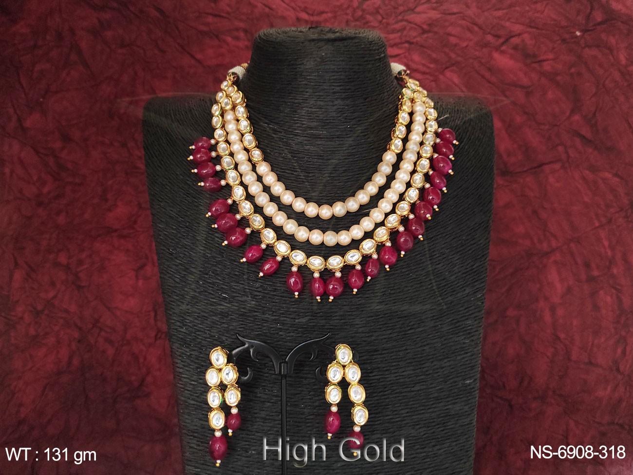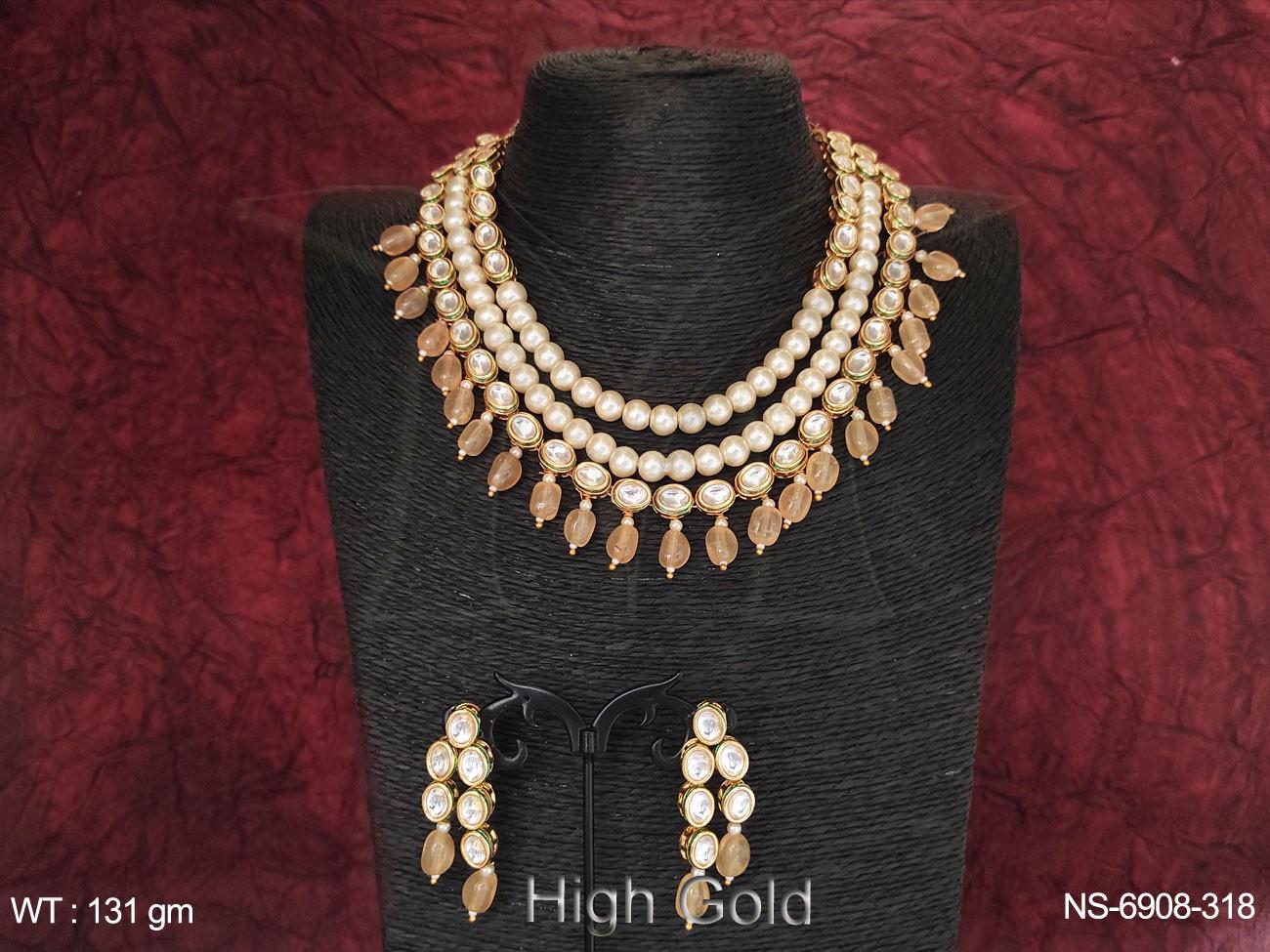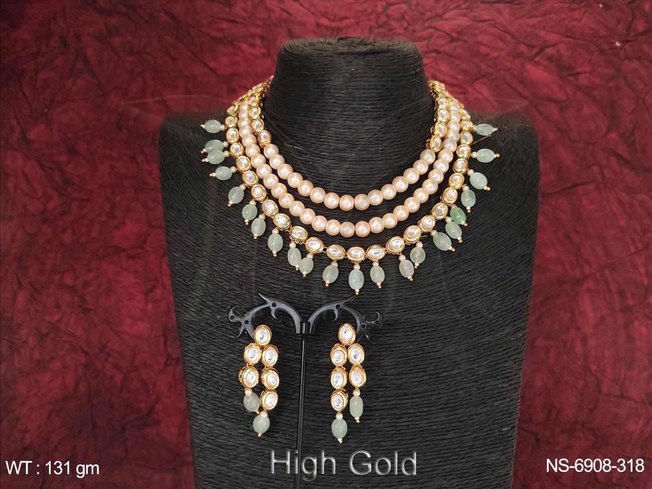 - Clustered pearl Kundan Heavy Three Line Moti Kundan Necklace Set