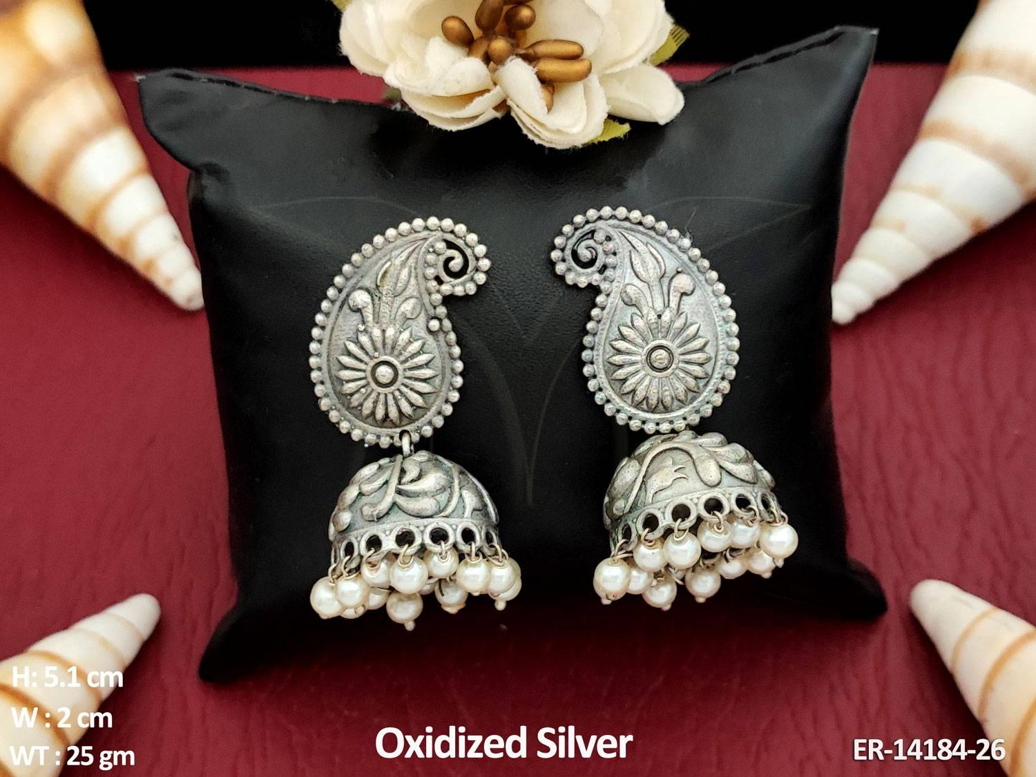 - Clusterpearls Designer Wear Oxidized Silver Polish Jhumka Earrings