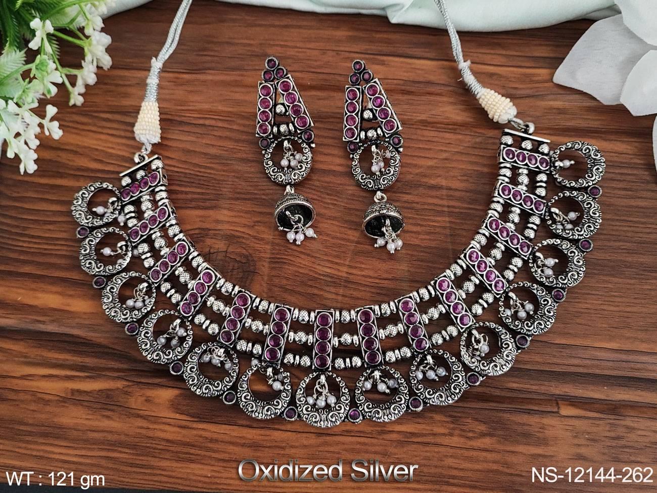 - Oxidised Silver Polish Fancy Style Party wear Beautiful Designer Oxidised Silver Jewellery Necklace Set