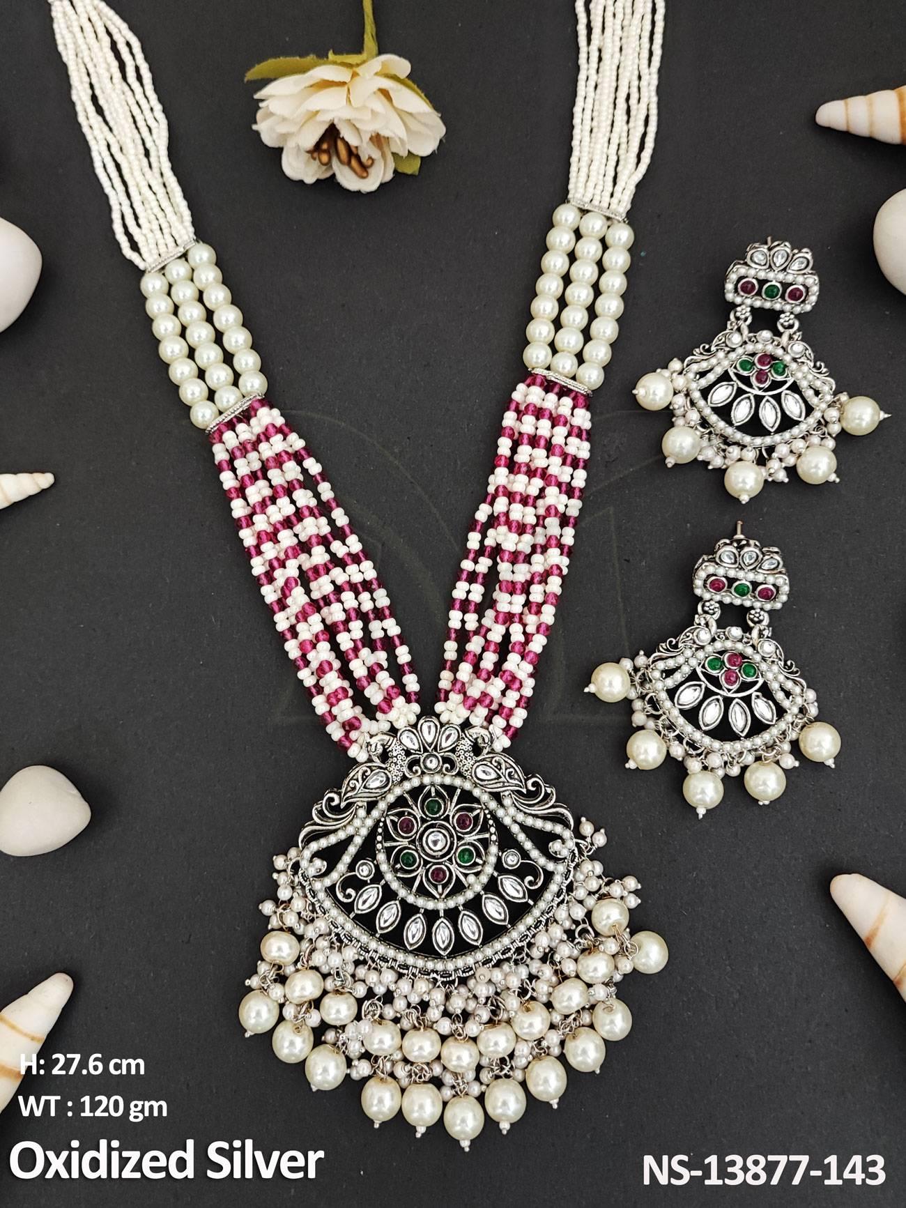 2. Peacock Design Oxidized Silver Polish Clusterpearls Jewellery Oxidized Long Necklace Set