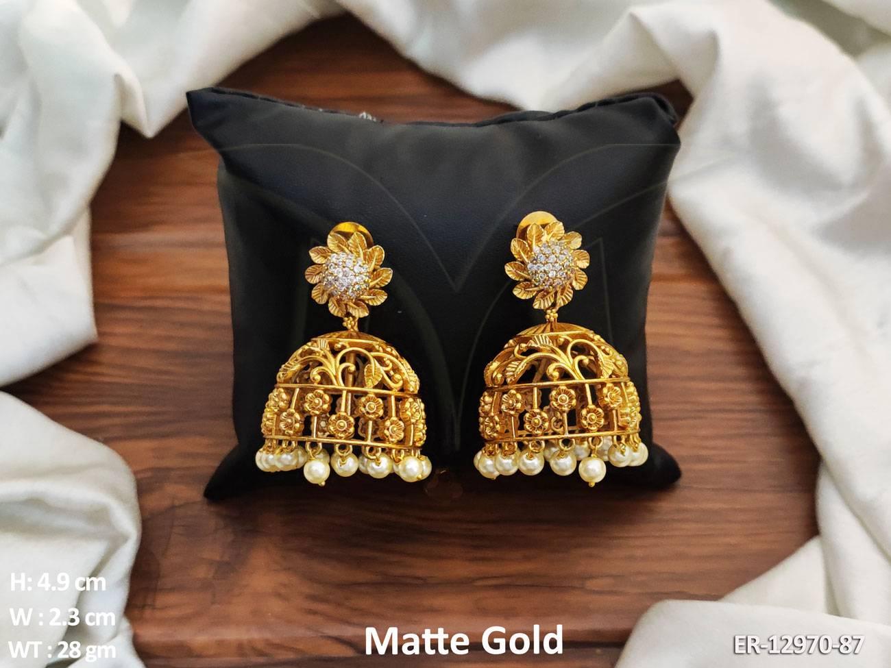 - Plain Gold Flower Design Matte Gold Polish Kemp Jhumka Earrings Set