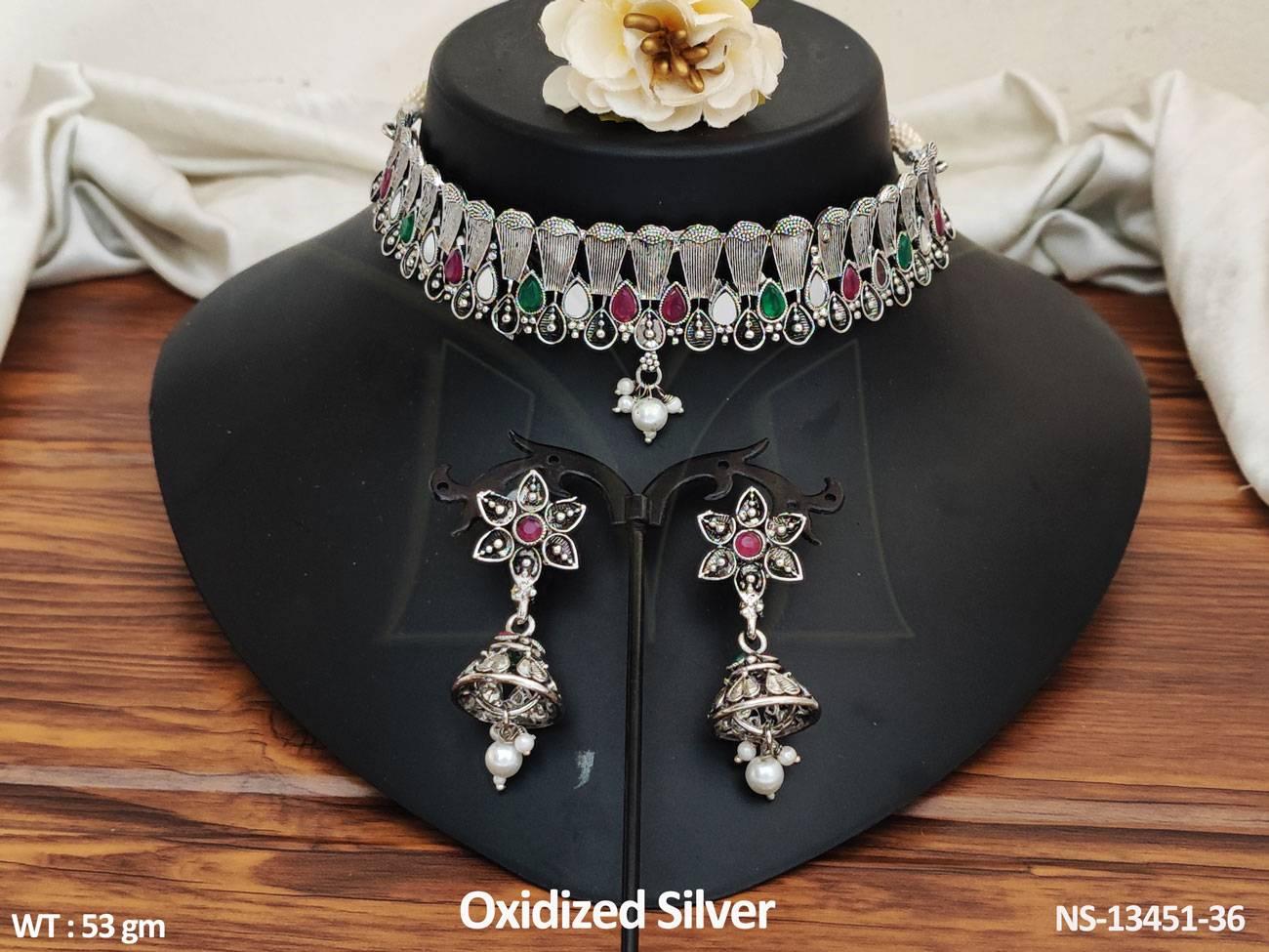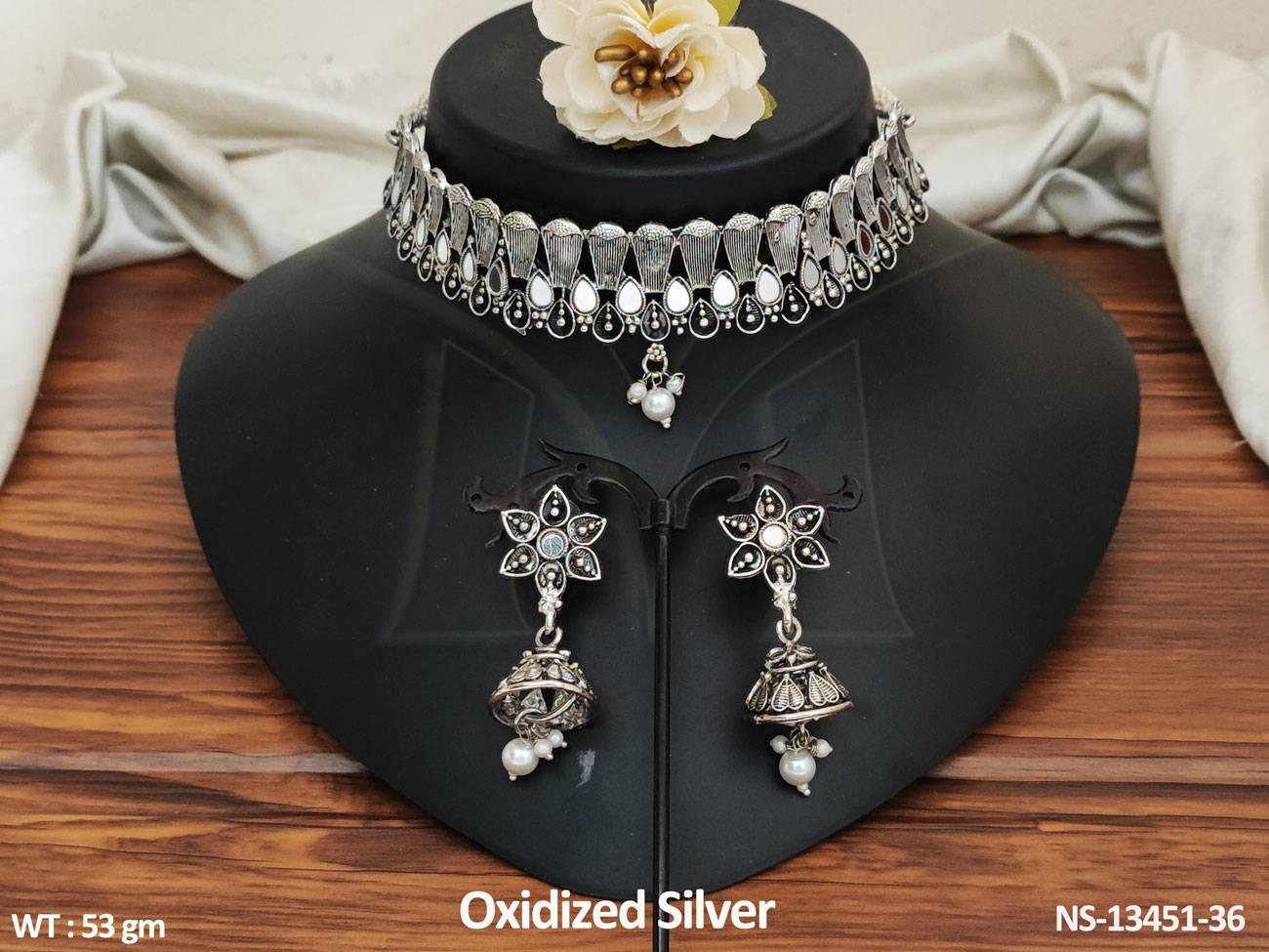 - Clustered Pearl Fancy Style Party wear Beautiful Oxidised Silver Polish Oxidised Jewelery Choker Necklace Set