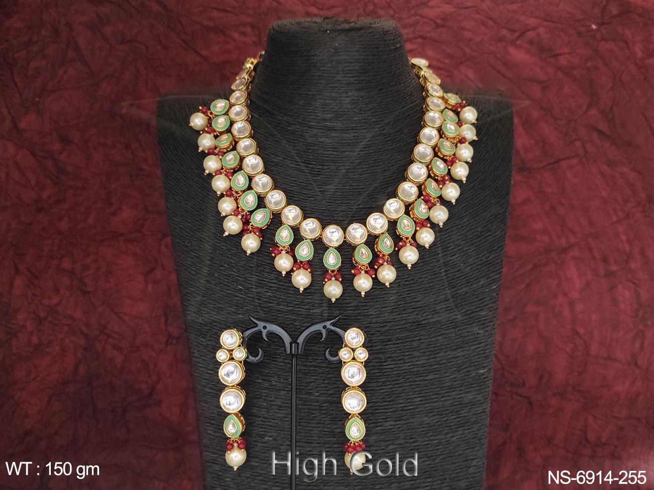 - Clustered pearl Full Stone Kundan Havy Paan Round Stone High Gold Polish Necklace Set
