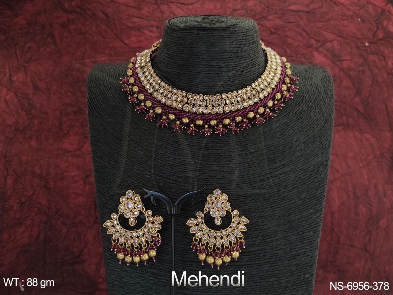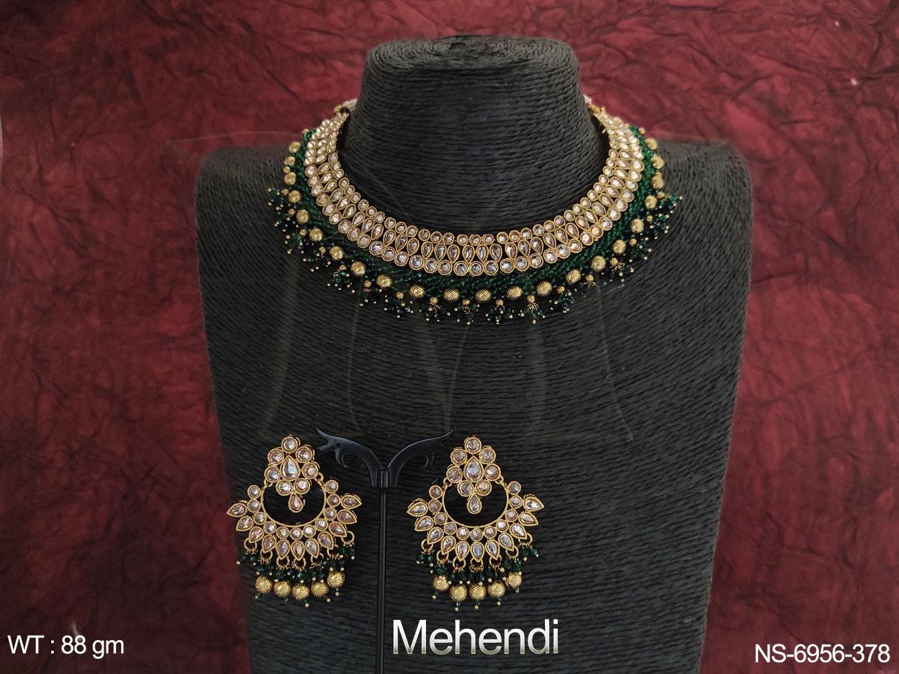 - Clustered pearl Full stone polki Mehendi Polish Desgner Heavy necklace Set.