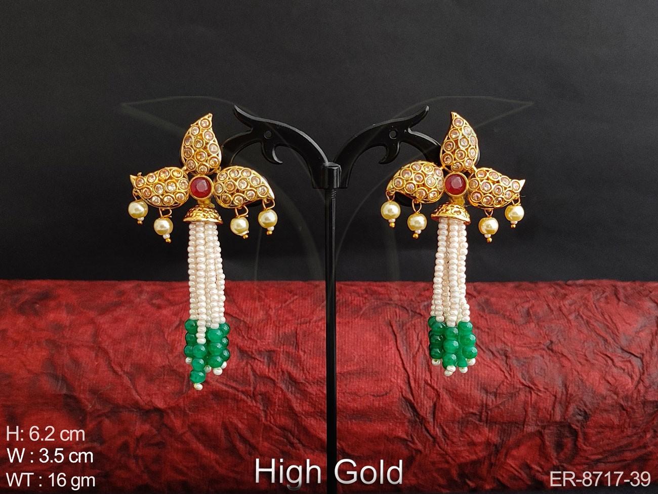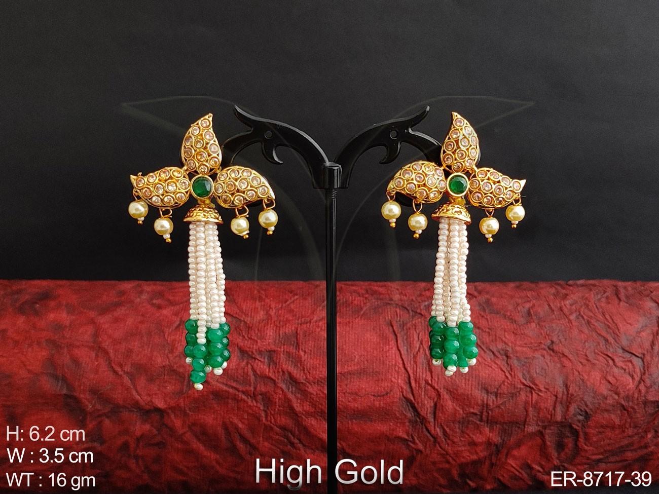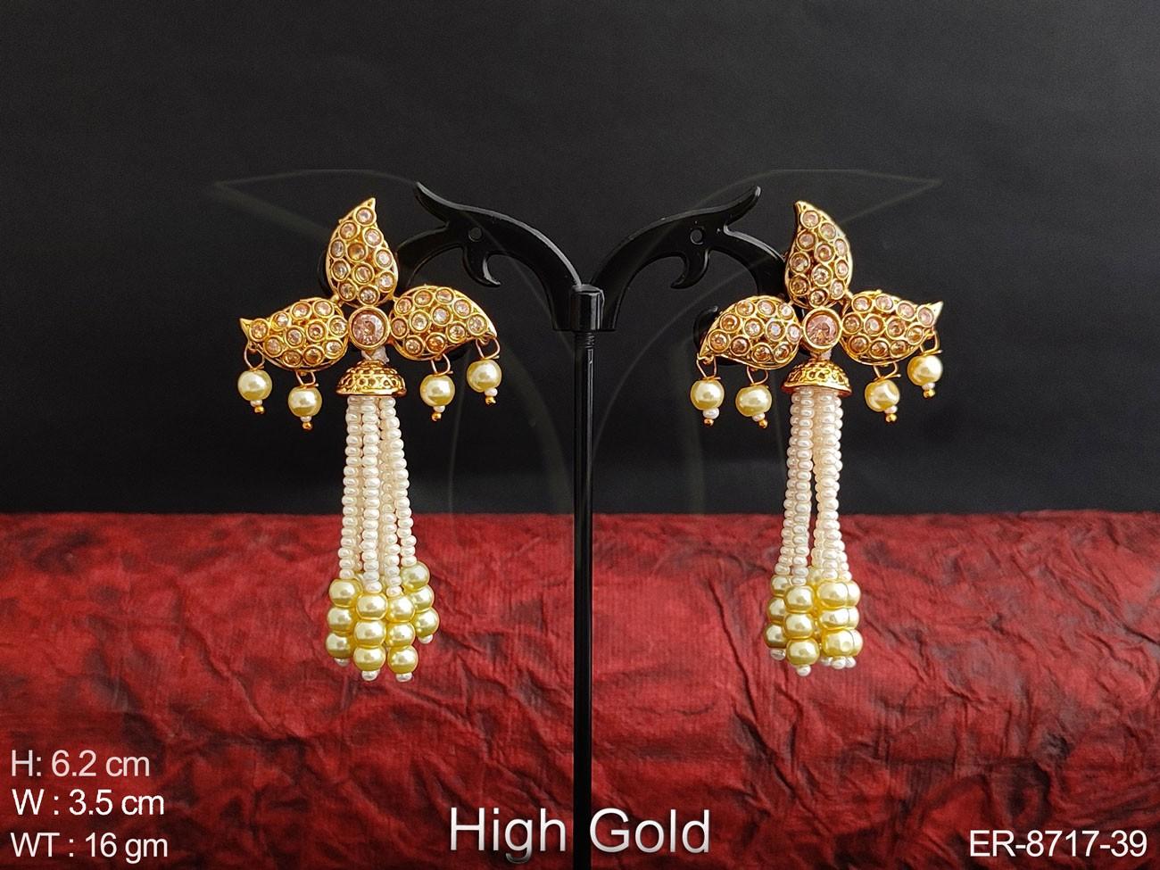 - Designer Fancy High Gold Polish Clustered Pearl full white Stones Antique Party wear Long Earring