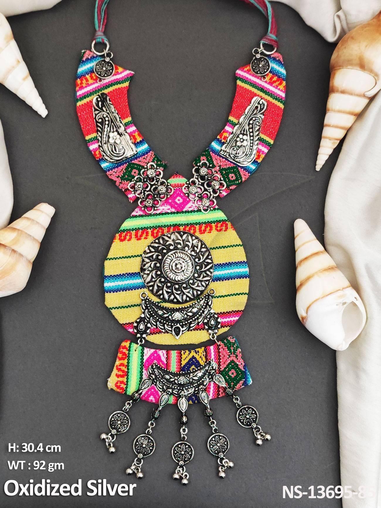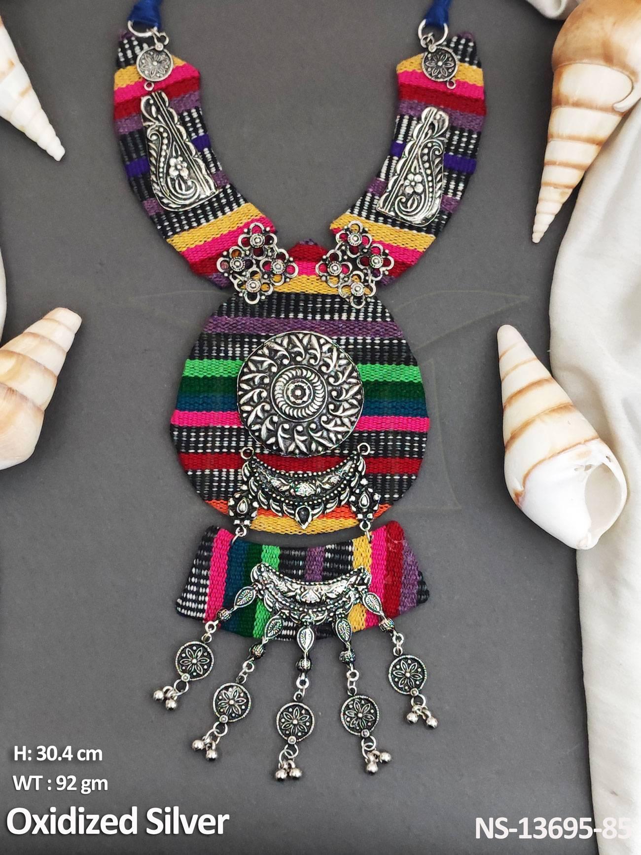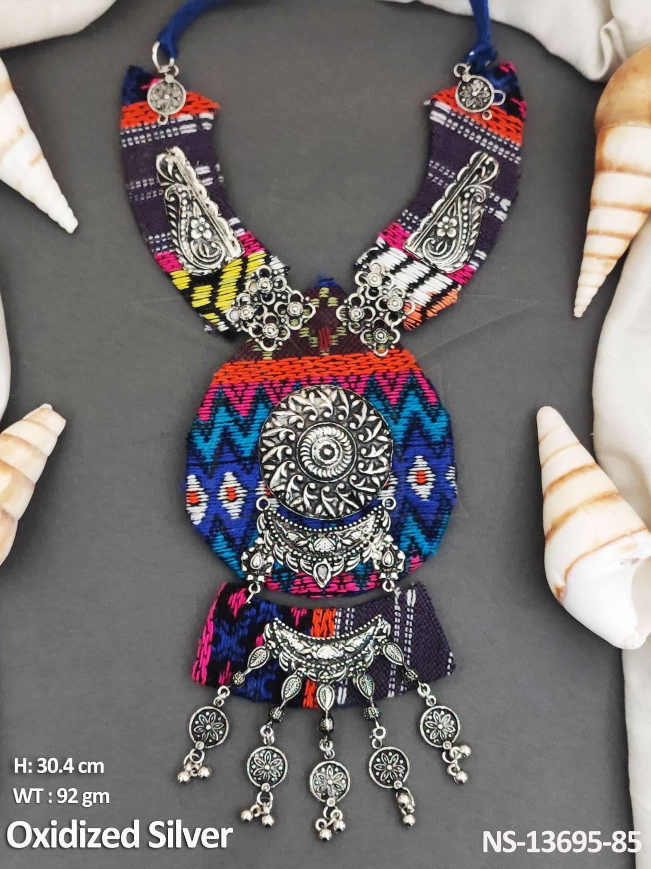 - Designer Fancy Style Party wear Beautiful Fabric Oxidised Silver Polish Oxidised Fabric Jewellery Long Necklace Set
