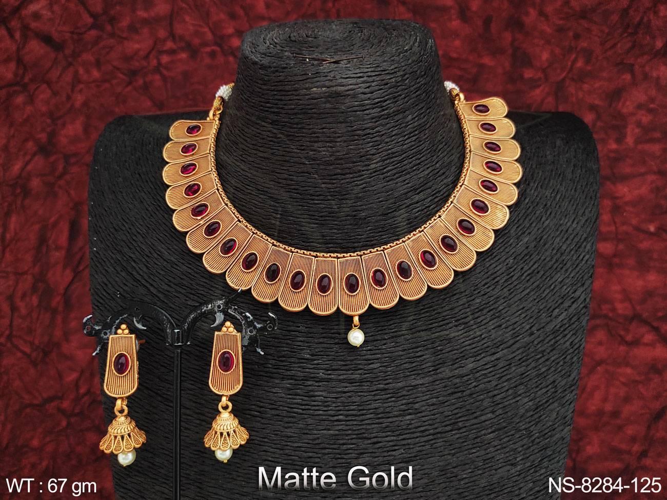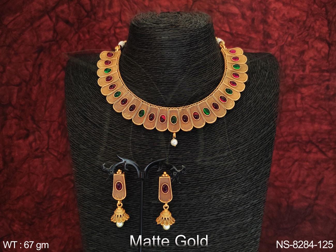 - Designer Kemp Jewelry Fancy Style Matte Gold Polish with Stones Party wear Choker Style Beautiful Necklace Set