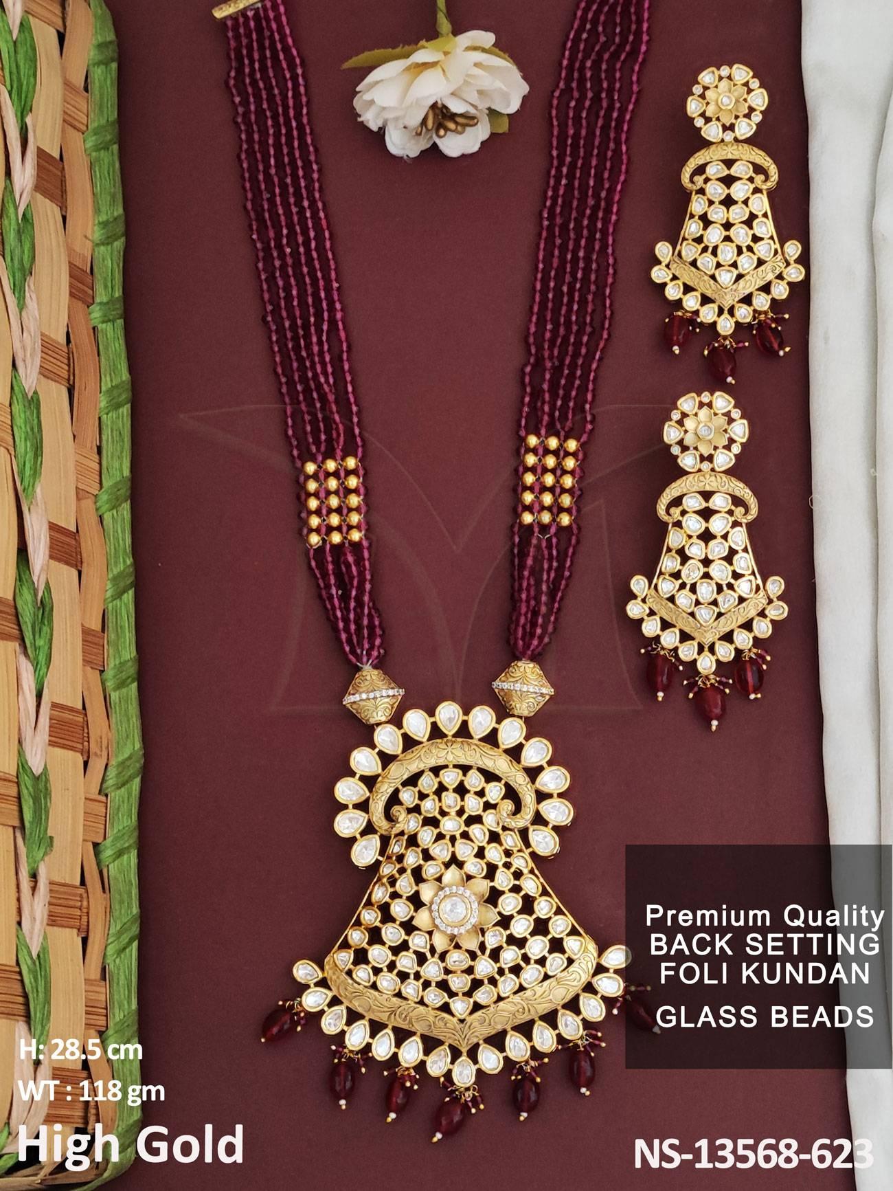 - Fancy Design Clustered Pearl High Gold Polish Beautiful Long Kundan Necklace Set