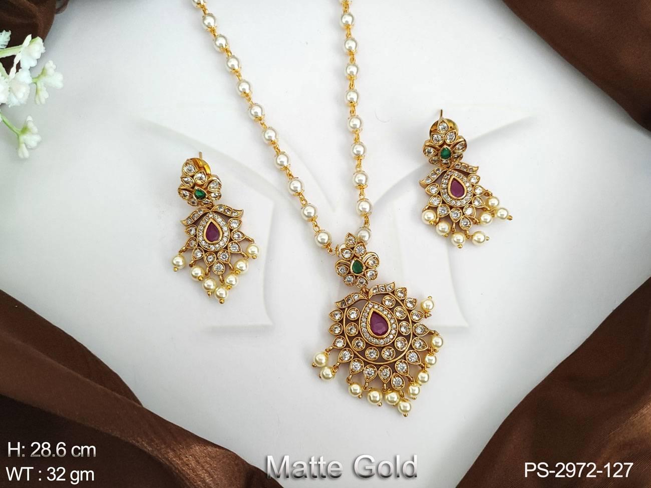 Matte Gold Polish Fancy Style Party wear Long Kemp Jewellery Kemp Necklace Set