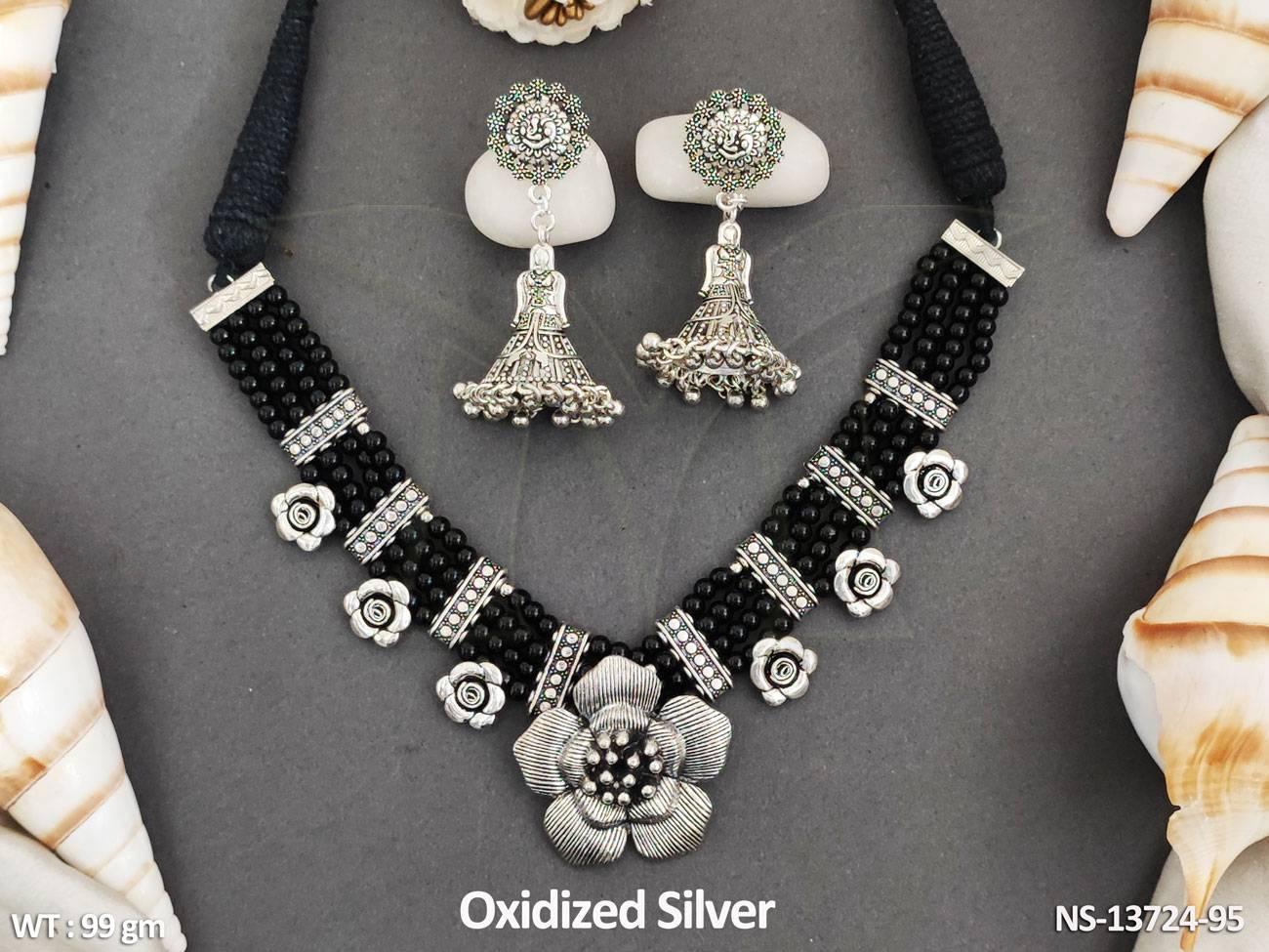 - Oxidised Silver Polish Antique Style Party wear beautiful Beaded Oxidised Silver Short Necklace Set
