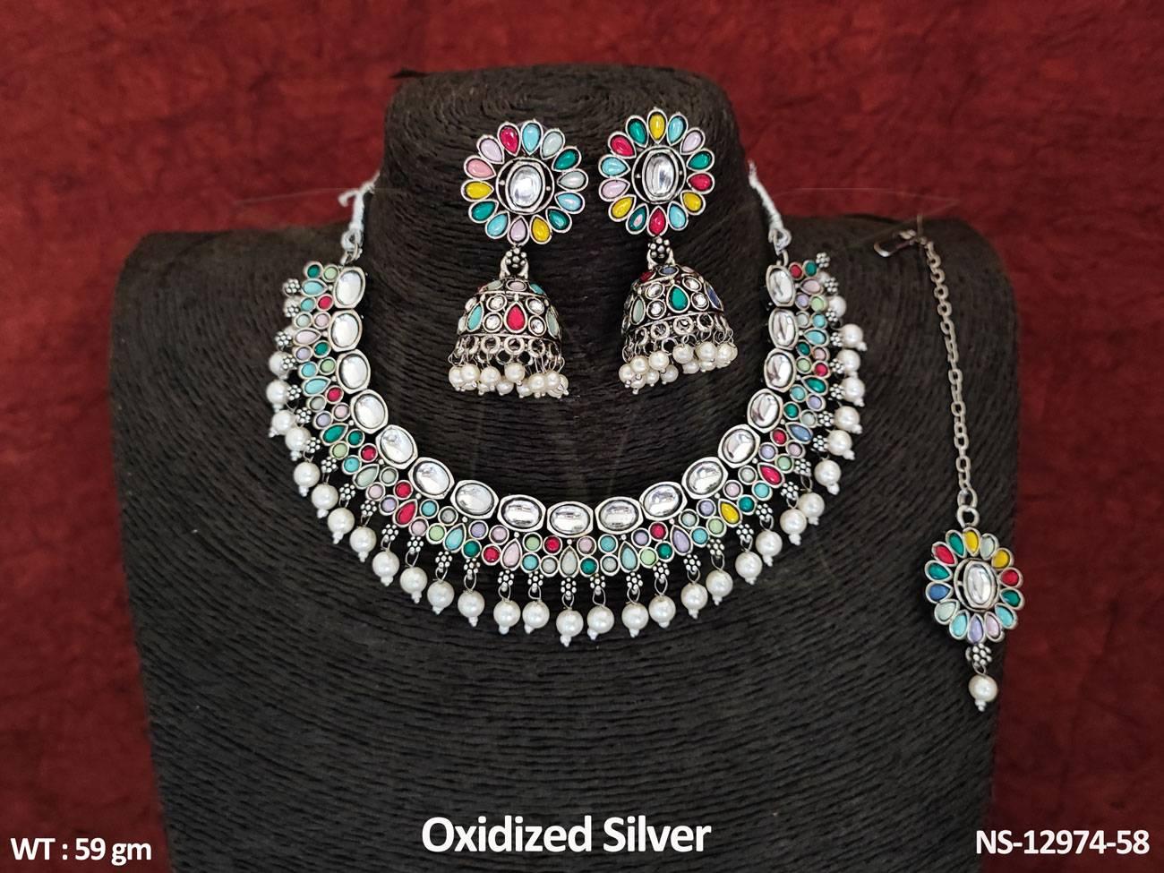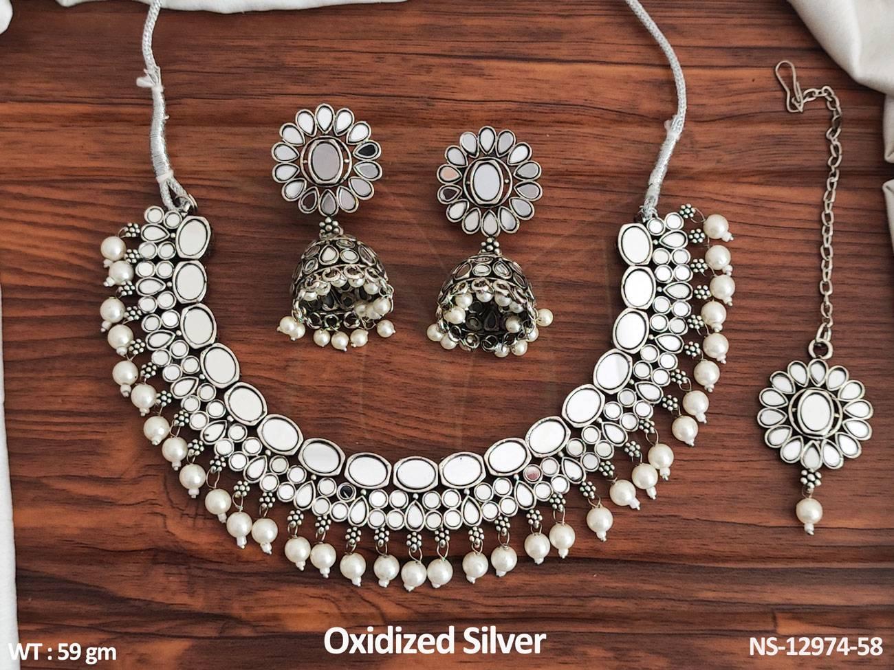 - Oxidised Silver Polish Clustered Pearl Party wear Heavy Choker Style Oxidised Necklace Set