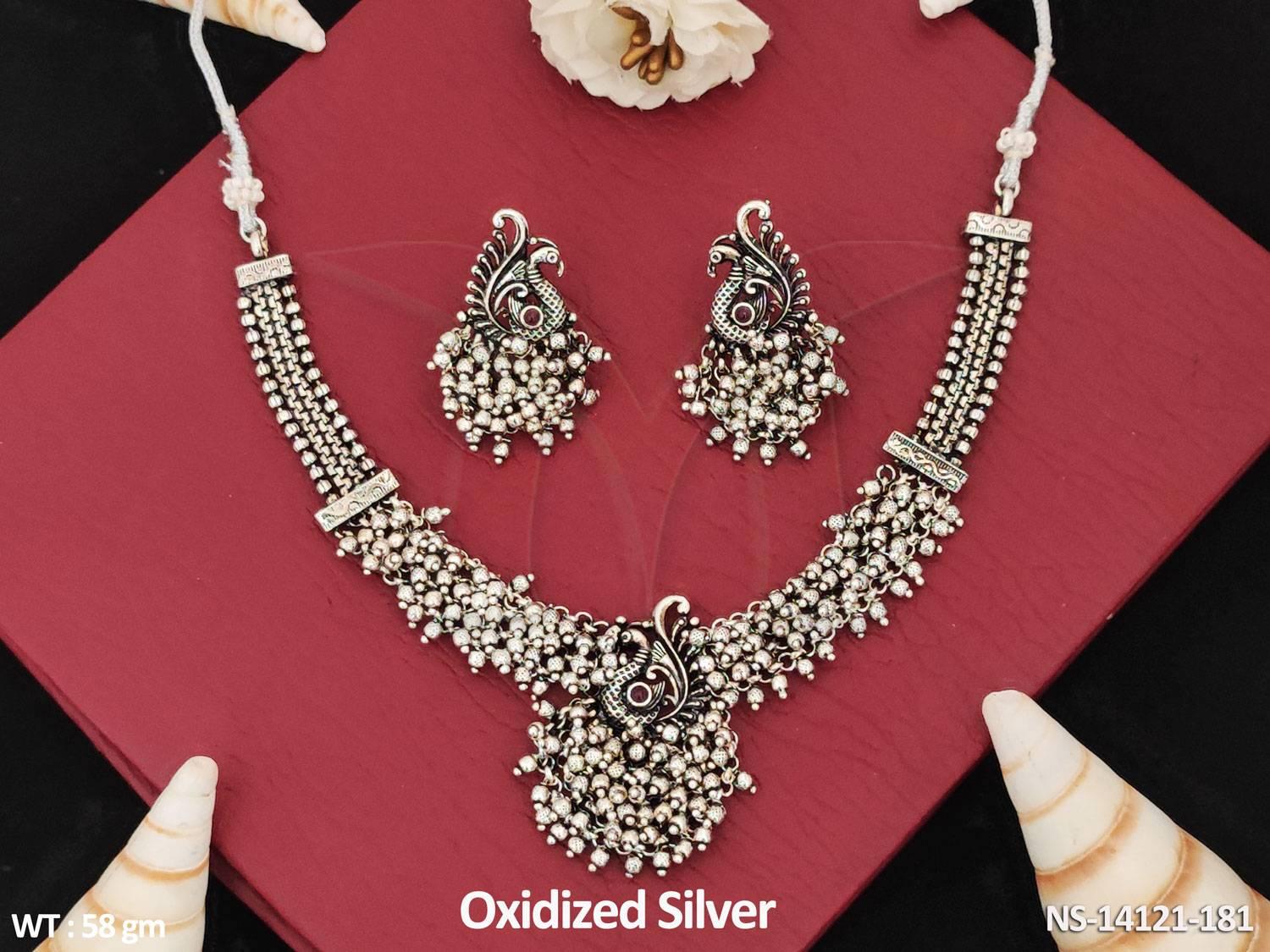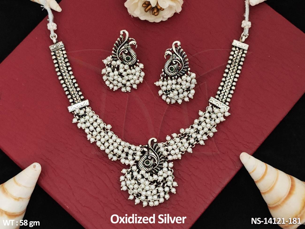 - Oxidized Jewelry Silver Polish Party Wear Fancy Peacock Design Cluster pearls Oxodised Necklace Set
