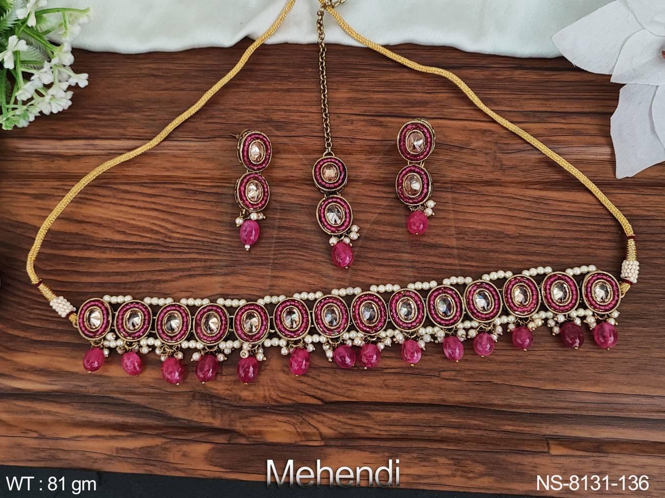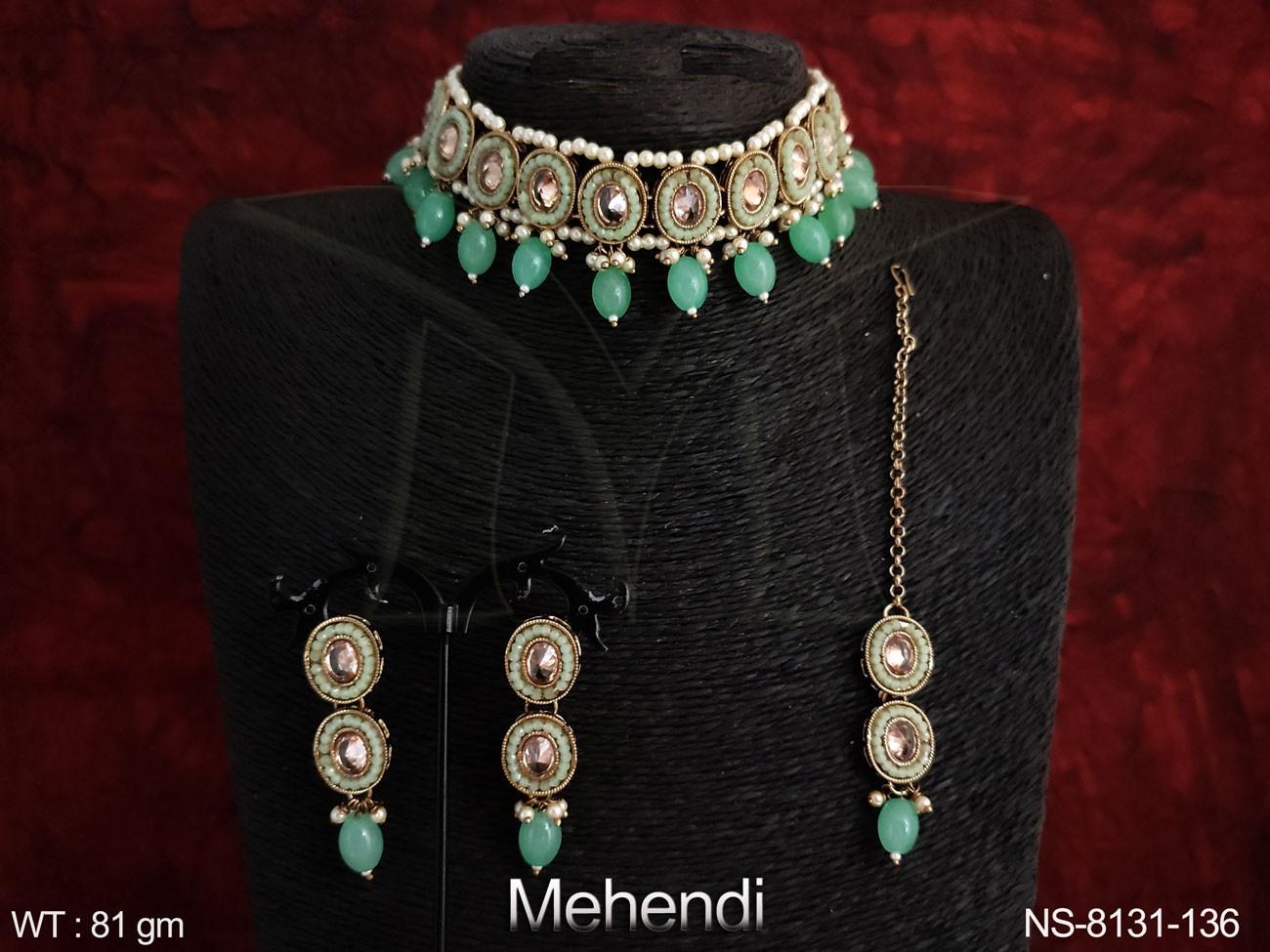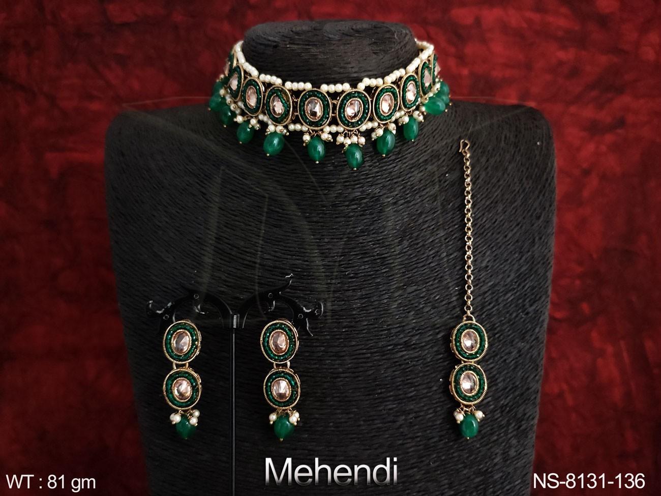 - POLKI OVAL SHAPE FULL STONES DESIGNER MEHENDI POLISH NECKLACE WITH MAANG TIKKA