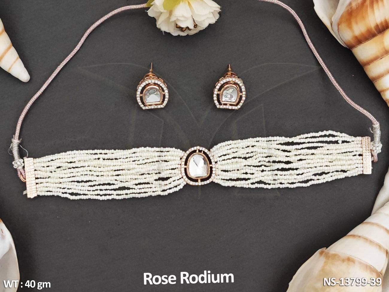 - Rose Rodium Polish Fancy Style Kundan Stones Beautiful Beaded Choker Necklace Set